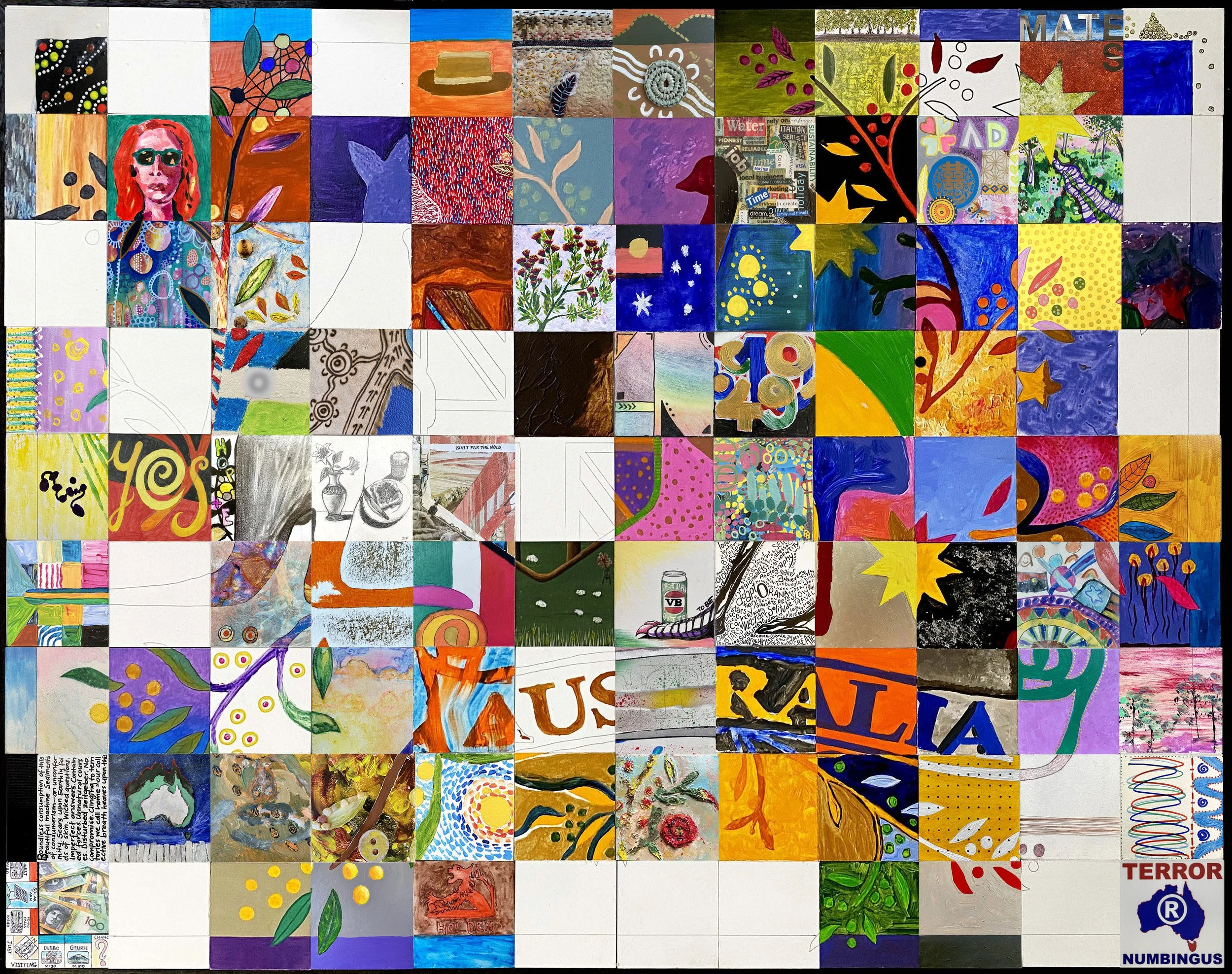 Produced in collaboration with Arts in Health Symposium delegates at Western Plains Cultural Centre, Dubbo. I was invited to deliver a talk on the integration of health in art and sought participation by handing out drawn tiles and coloured pencils during my session. I re-composited the image at the end of the talk on an easel at the podium.