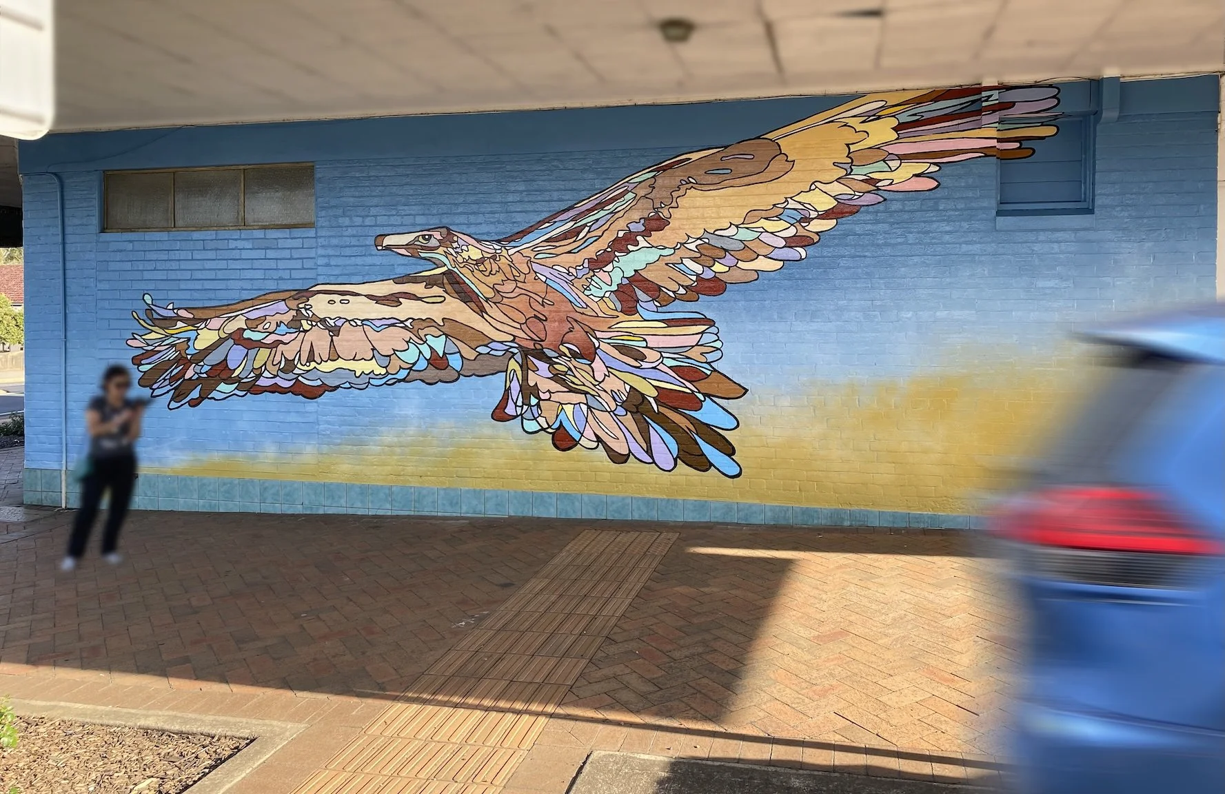 Maliyan is the Wiradjuri word for Wedged-tailed Eagle, a local totem for both women and men, and a local football team. Maliyan was chosen through a series of community consultations, drawn and designed as a mural for approval before painting. Community was also invited to paint with the Fishdog team in supervised on-site workshops.